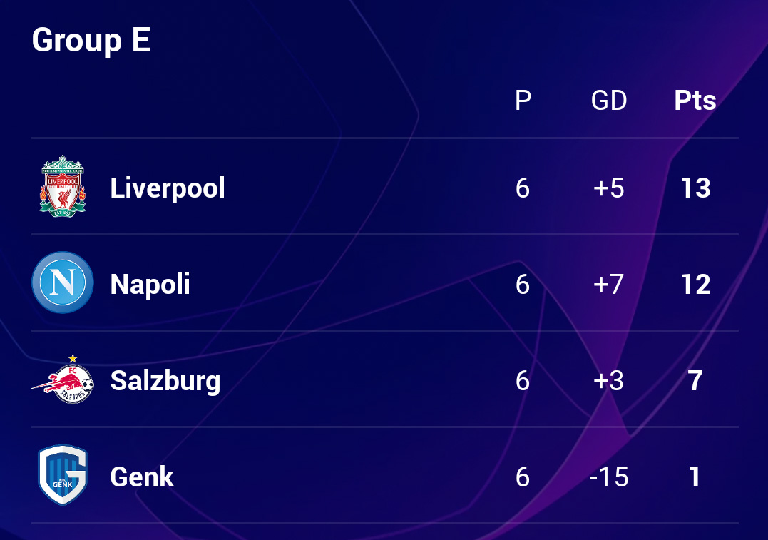 - C Grubu: 1. Real Madrid, 2. Napoli, 3. Sporting Lizbon, 4. Celtic