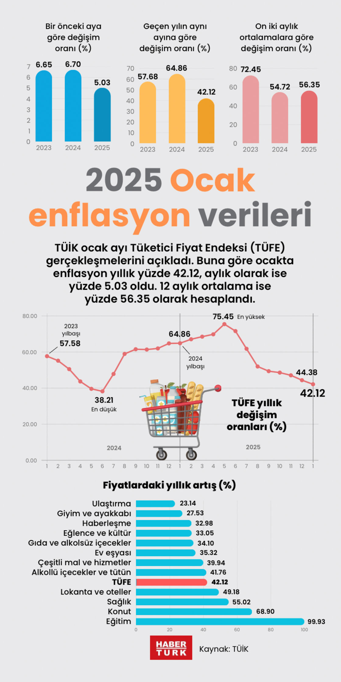 Türkiye İstatistik Kurumu (TÜİK) tarafından açıklanan verilere göre, 2024 Ocak ayında yıllık enflasyon yüzde 50,2 olarak hesaplandı. Bu rakam, bir önceki ay olan Aralık 2023’e göre 1,5 puanlık bir artışı göstermektedir. Tüketici fiyat endeksi (TÜFE) ise bir önceki aya göre yüzde 3,2 oranında bir artış gösterdi.