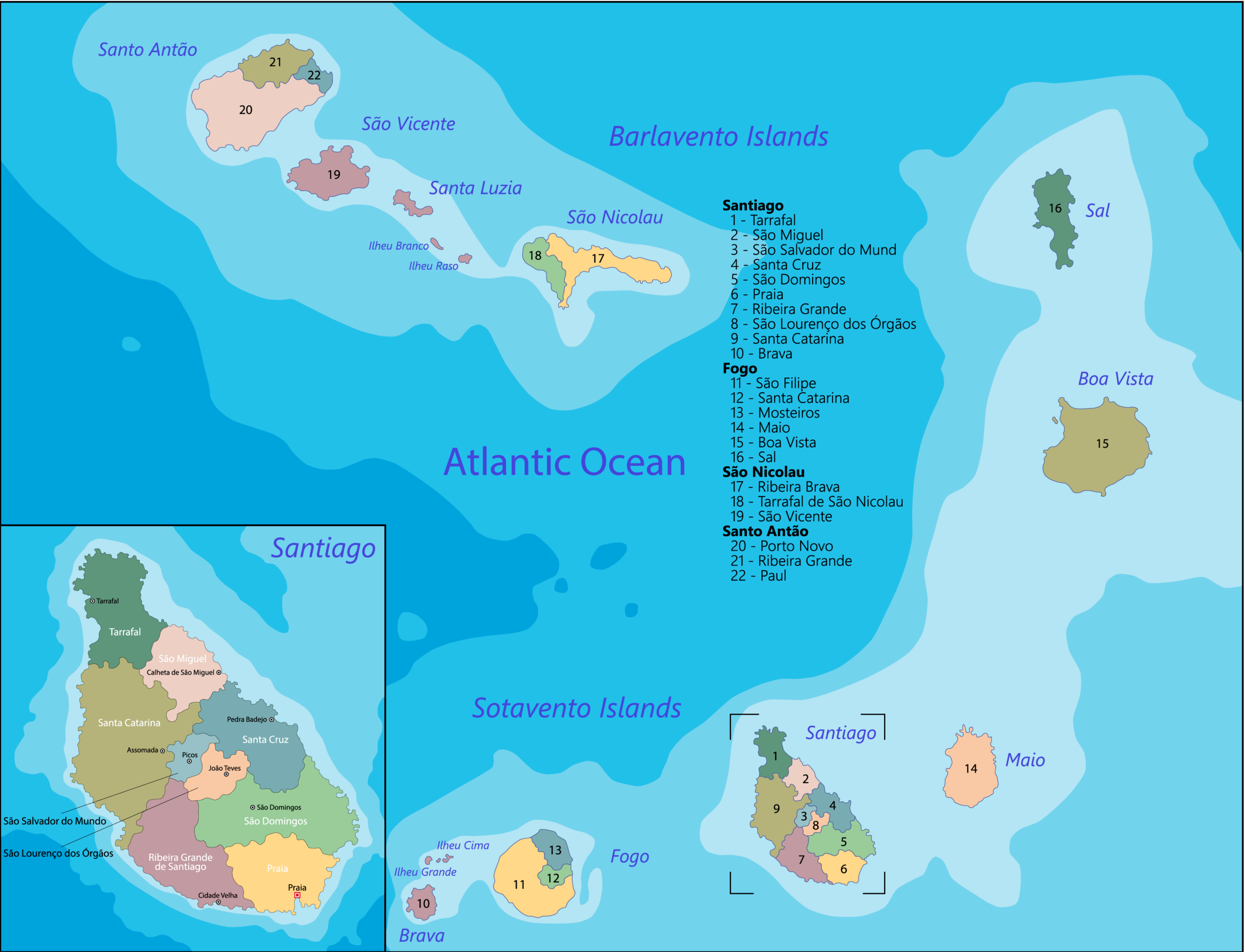 Bu ada grubu, dağlık arazileri, volkanik zirveleri ve göz alıcı kumsalları ile ünlüdür. Özellikle Santo Antão Adası, yürüyüş ve doğa severler için benzersiz bir deneyim sunmaktadır. Ayrıca, Sal Adası’nın beyaz kumlu plajları ve berrak denizi, su sporları ve güneşlenmek isteyen ziyaretçiler için idealdir. Cabo Verde’de ayrıca eşsiz doğal parklar ve UNESCO Dünya Mirası listesindeki tarihi alanlar bulunmaktadır.