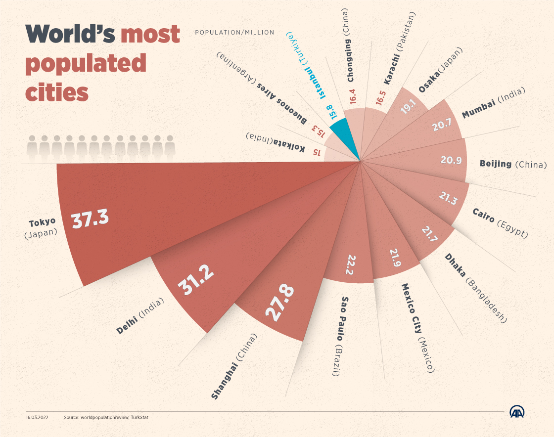 2023 yılı itibarıyla, dünyanın en kalabalık şehirleri arasında Tokyo (Japonya), Delhi (Hindistan) ve Şanghay (Çin) öne çıkmaktadır. Tokyo, yaklaşık 37.4 milyon nüfusu ile listede birinci sırada yer almaktadır. Tokyo’nun büyüklüğü, yalnızca nüfusuyla değil, aynı zamanda ekonomik gücüyle de dikkat çekmektedir.